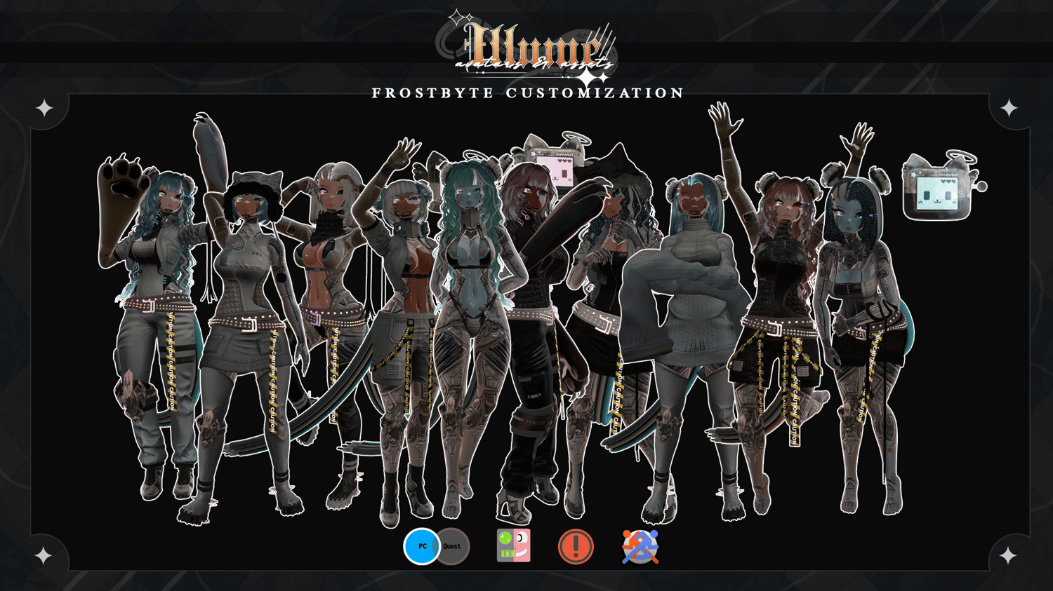 everything else: other hairs, body/face textures, arm wires, belts, bodysuit, boots, bra, mech buns, hat, heels, jacket, kneepad, pants, scarf, shorts, skirt, sweater, tail, top & undies all made by me, illumevr. if you have purchased the avatar, you may ONLY use the items I made on other personal avatars, you can only use other items if you have purchased them prior yourself as my TOS states.
