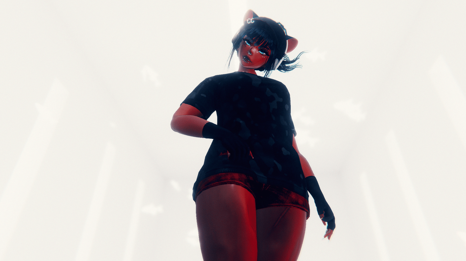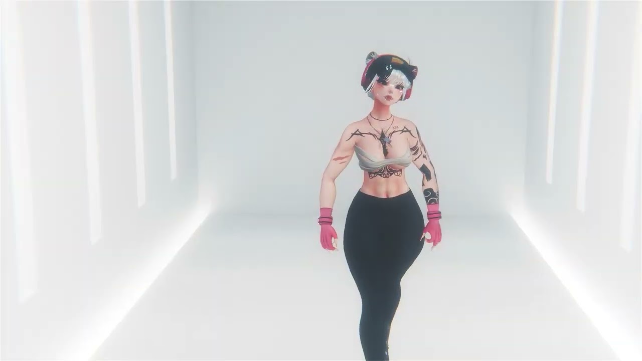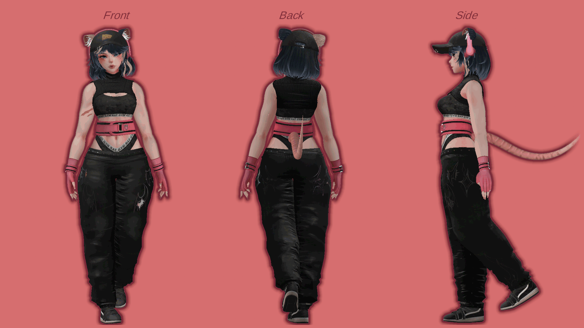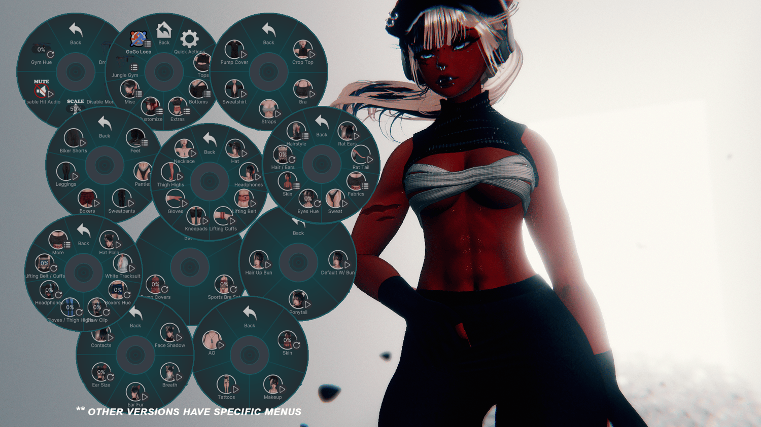 skin: tone radial, sweat option ( normal map + shine ), makeup toggle, tattoo toggle, AO toggle. hair: radial for hair / ear color options + split dyes, default hair, default hair + clawclip bun, ponytail or hair up with clawclip bun. fabrics: hat with cheese or plain, white/black tracksuit, boxers hue, claw clip hue, gloves / thigh high hue, headphones hue, lifting belt / cuffs hue, sports bra set ( black plain, black camo, hue shift for camo & hue shift for plain texture. ), t - shirt radial ( black shirt w/ design, white shirt w/ angel number on back, black tie dye, white tie dye, acid wash hue shift + white. ) other: eyes hue, rat tail & ears toggle.