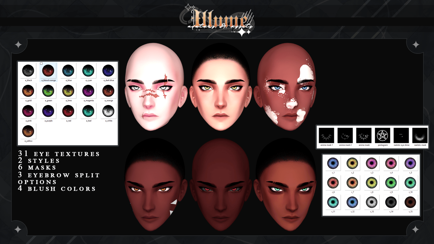 - There are 31 eye textures total, two styles of each, an anime & a more realistic one. There are 6 additional masks for them as well!