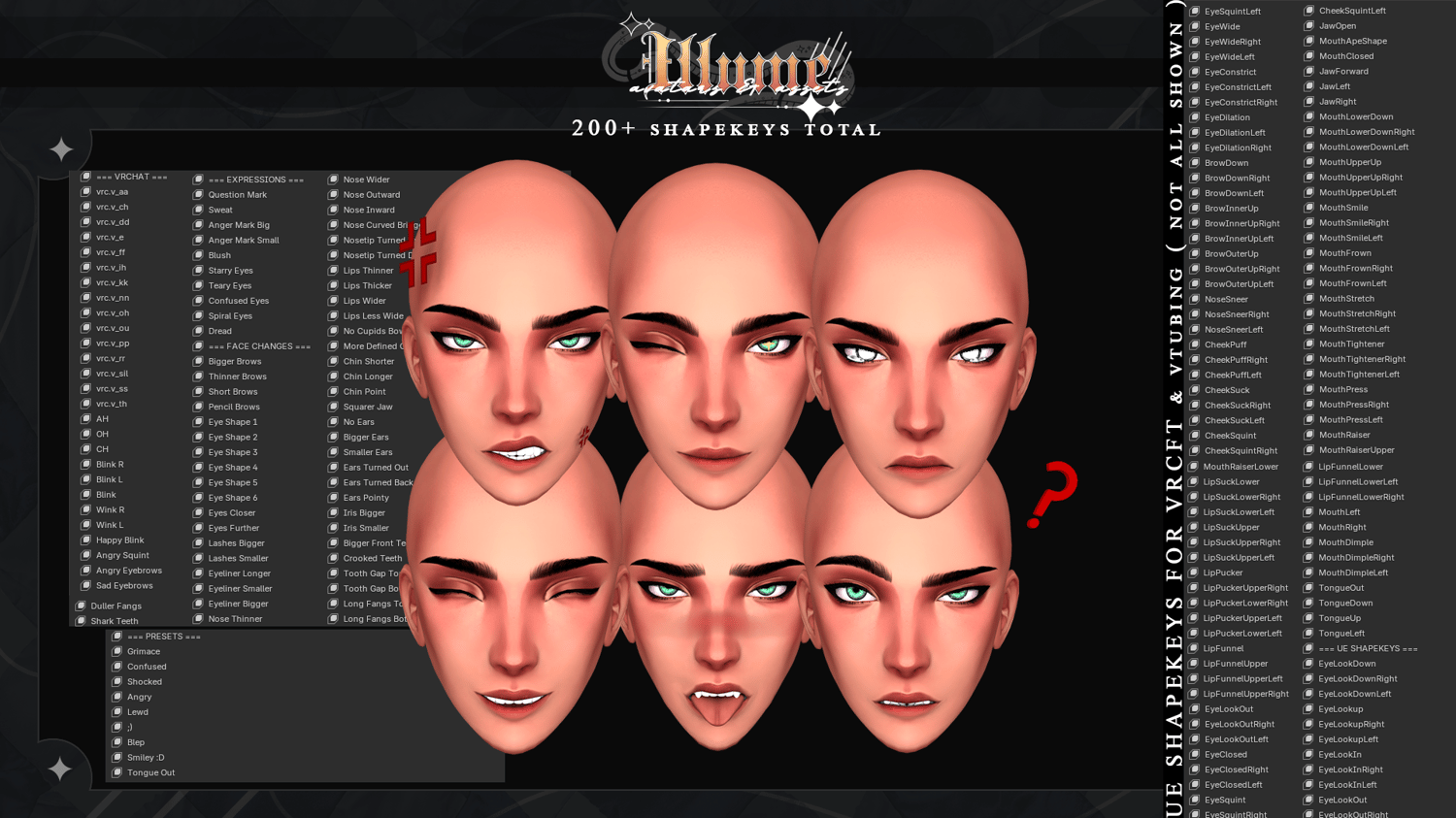 - Presets for six different eye shapes, tons of customization, several expressions, transparent emotes, visemes & more! There's 200 shapekeys total.