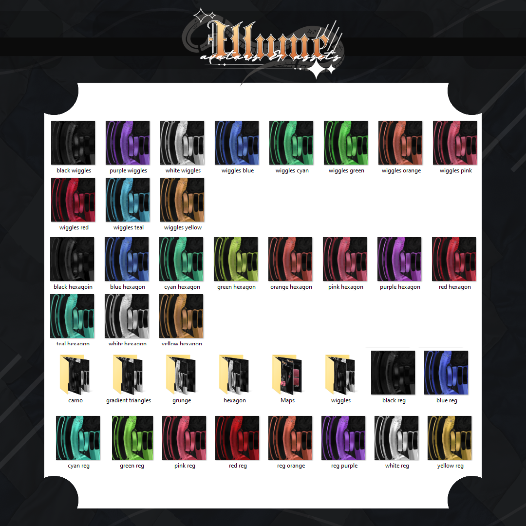 ➜ 6 different designs with hue variations of each included along with black & white for a total of 64 textures + maps.